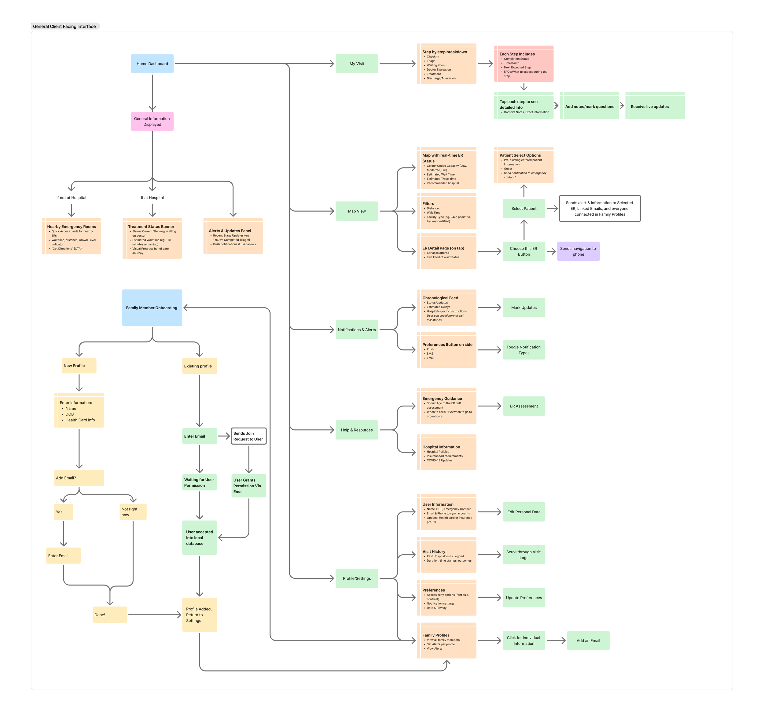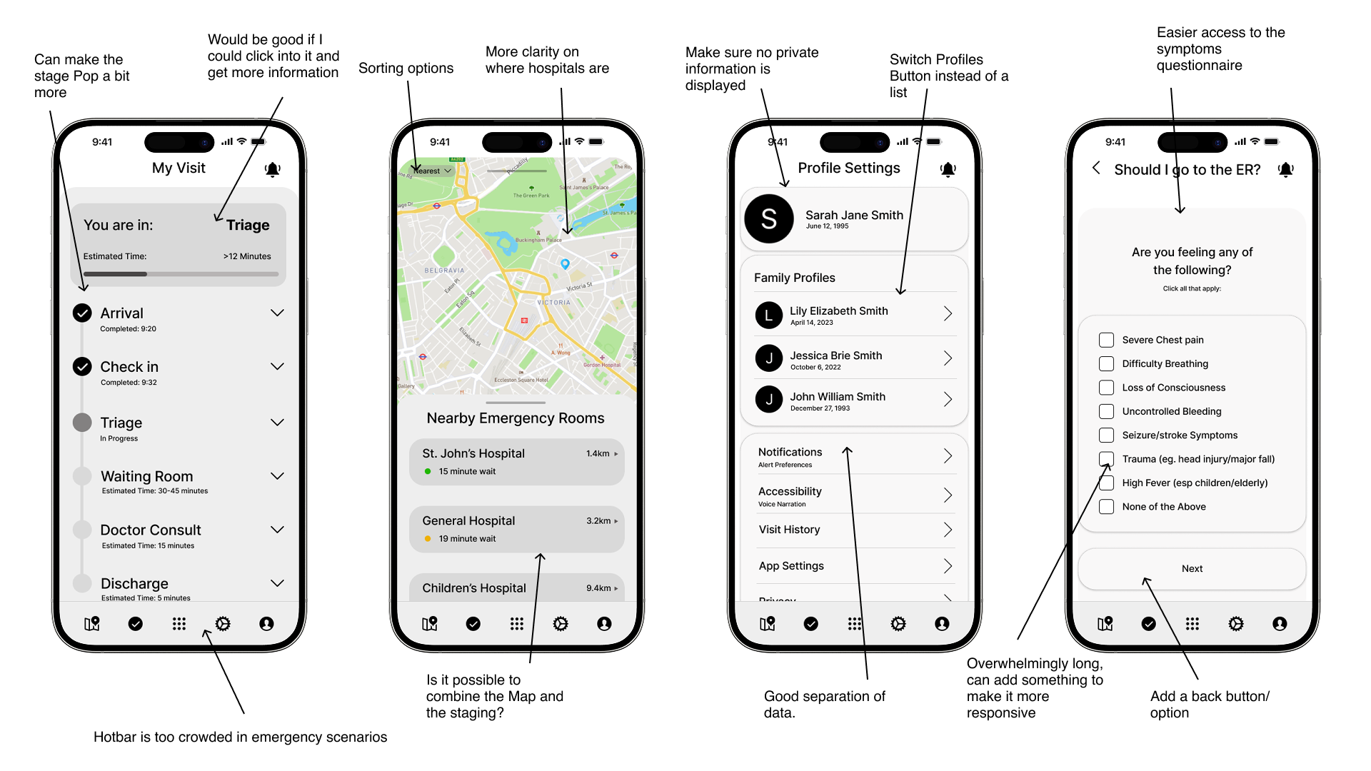 While early designs emphasized a broad suite of tools (e.g., hospital maps, ER comparisons, family profiles, etc.), users overwhelmingly responded most positively to features directly tied to their immediate ER journey. Tools that didn’t serve the “right here, right now” experience often went unused or confused first-time users.